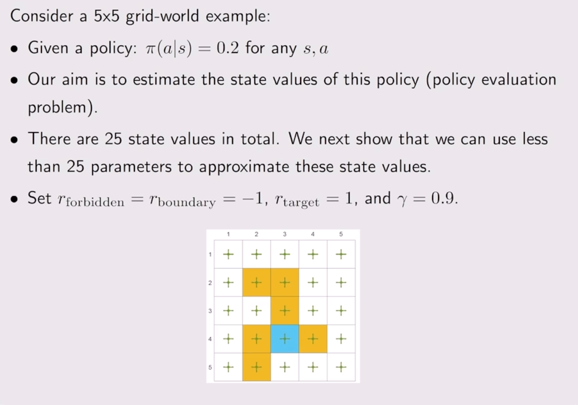 正式地定义 value function approximation: 我们希望得到 $v_{\pi}(s)$ 的近似, 即 $\hat{v}(s, w)$ . 即我们希望找到一个 $w$ 使得 $\hat{v}(s, w)$ 尽可能接近 $v_{\pi}(s)$ . 那么我们可以定义如下的目标函数: